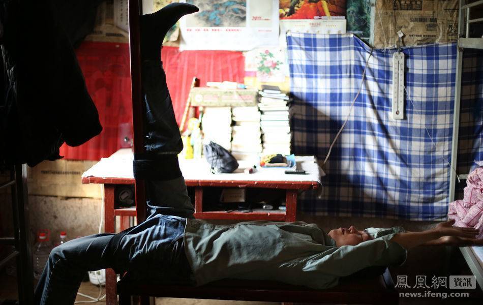 晨练完又做拉筋的小周。小周介绍,终南山上的人都知道萧宏慈,这是他全力倡导的拉筋凳。小周每次最少拉10分钟,感觉身体不舒服就练,拉完刚开始特麻,过一会儿就浑身轻松了。